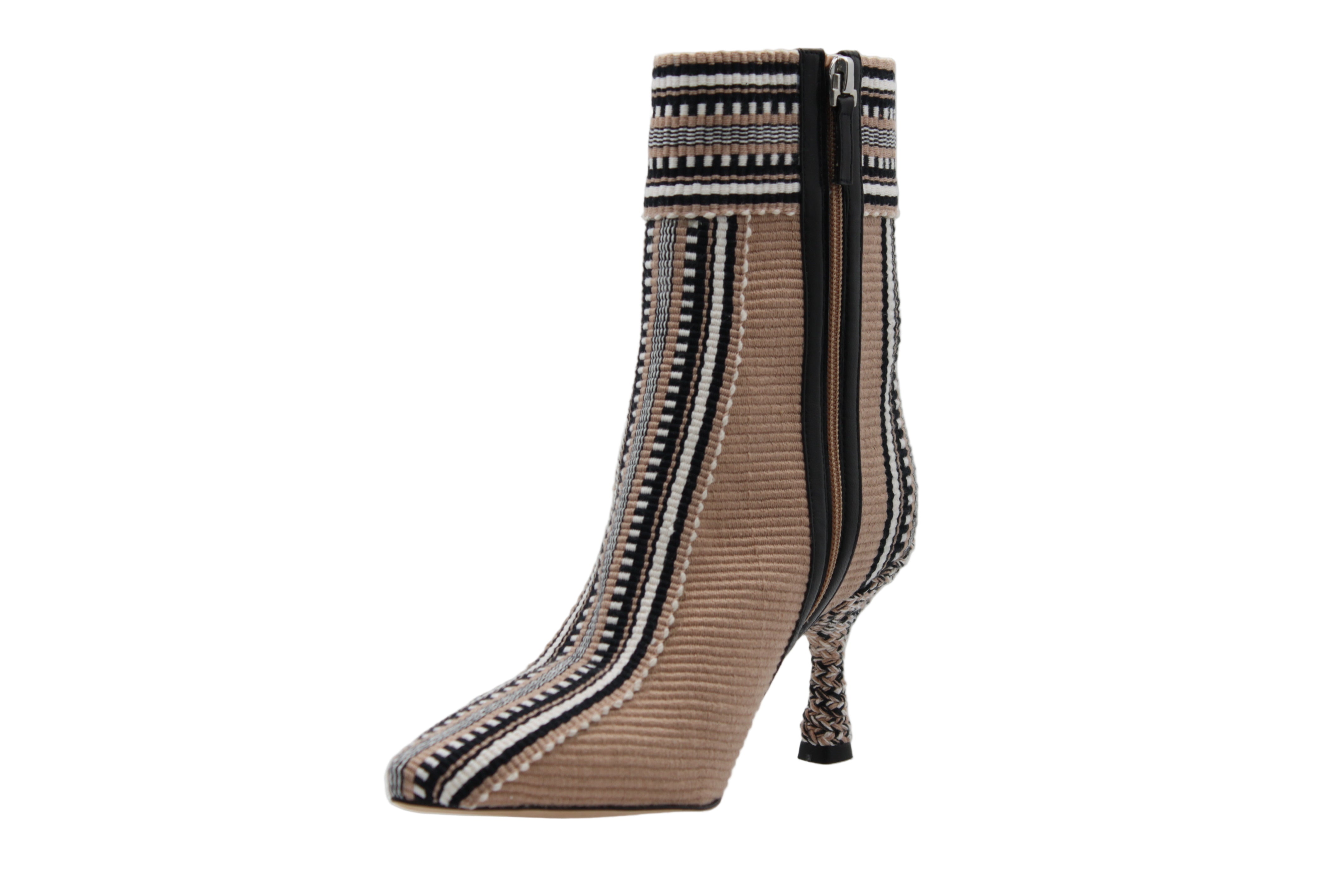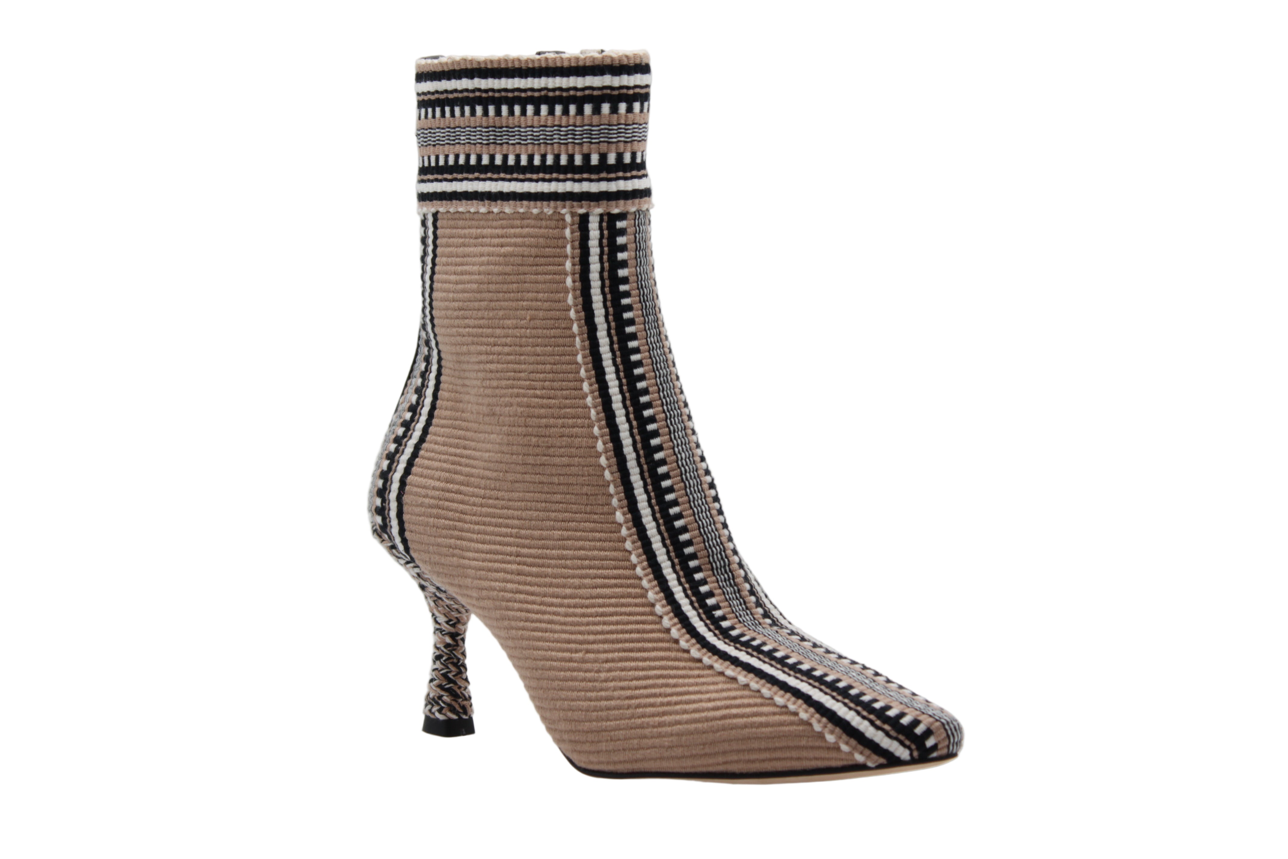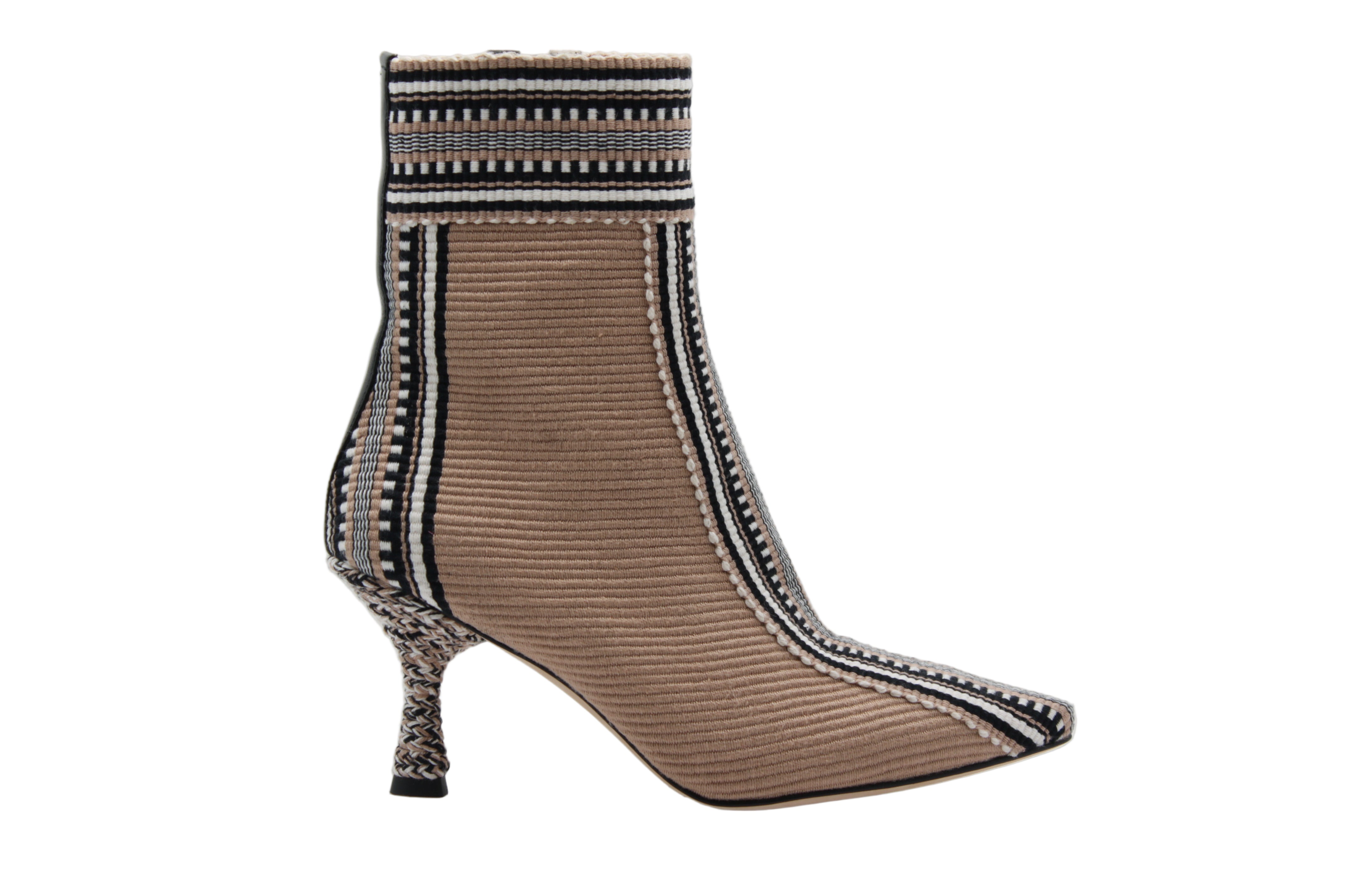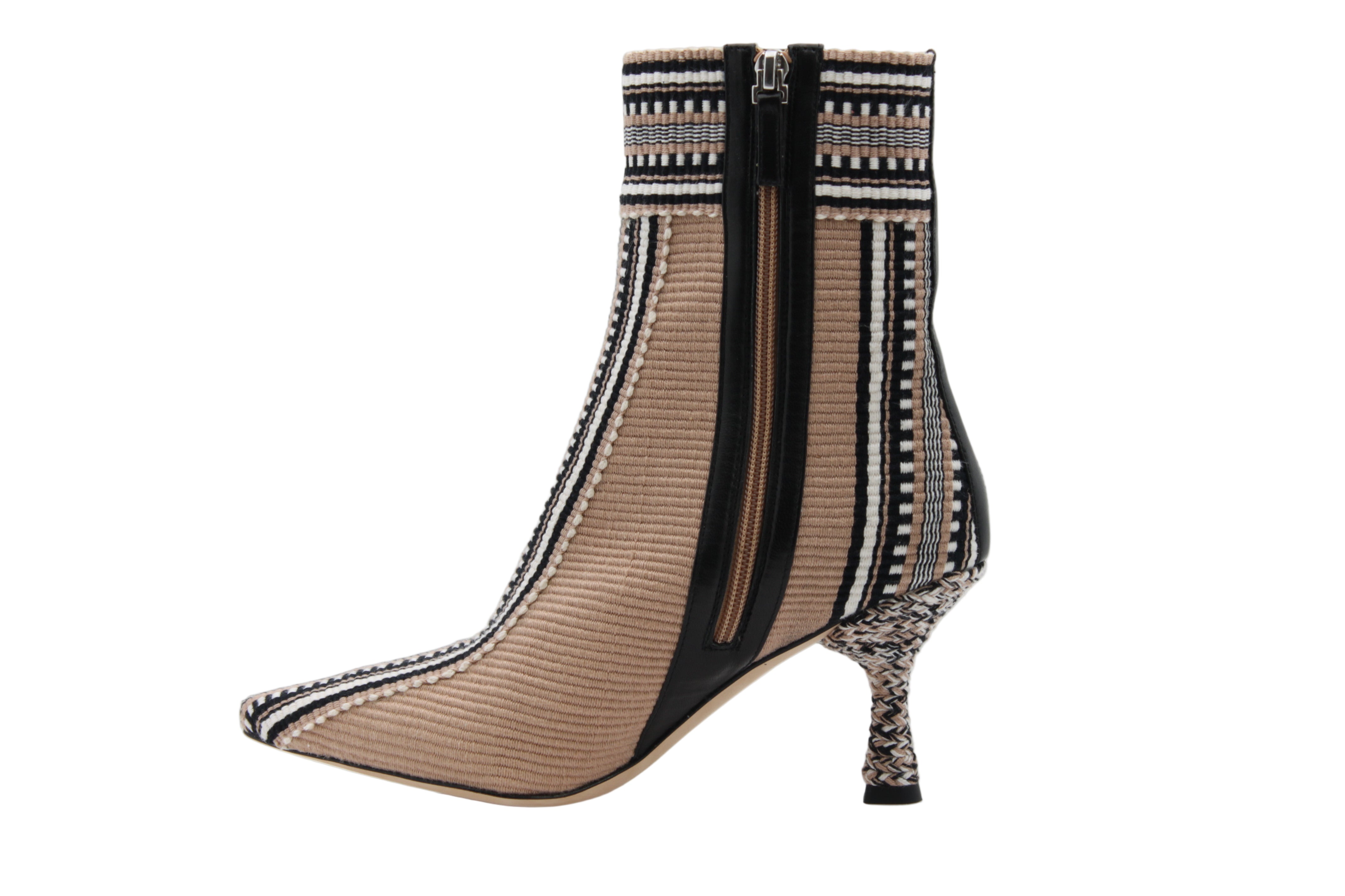 Entre créativité et élégance, la bottine Monica de Amambaih incarne l’esprit contemporain de la maison paraguayenne. Réalisée à la main, cette création unique mêle textile tissé brun à des motifs graphiques noirs et blancs, offrant une silhouette à la fois artistique et sophistiquée.
