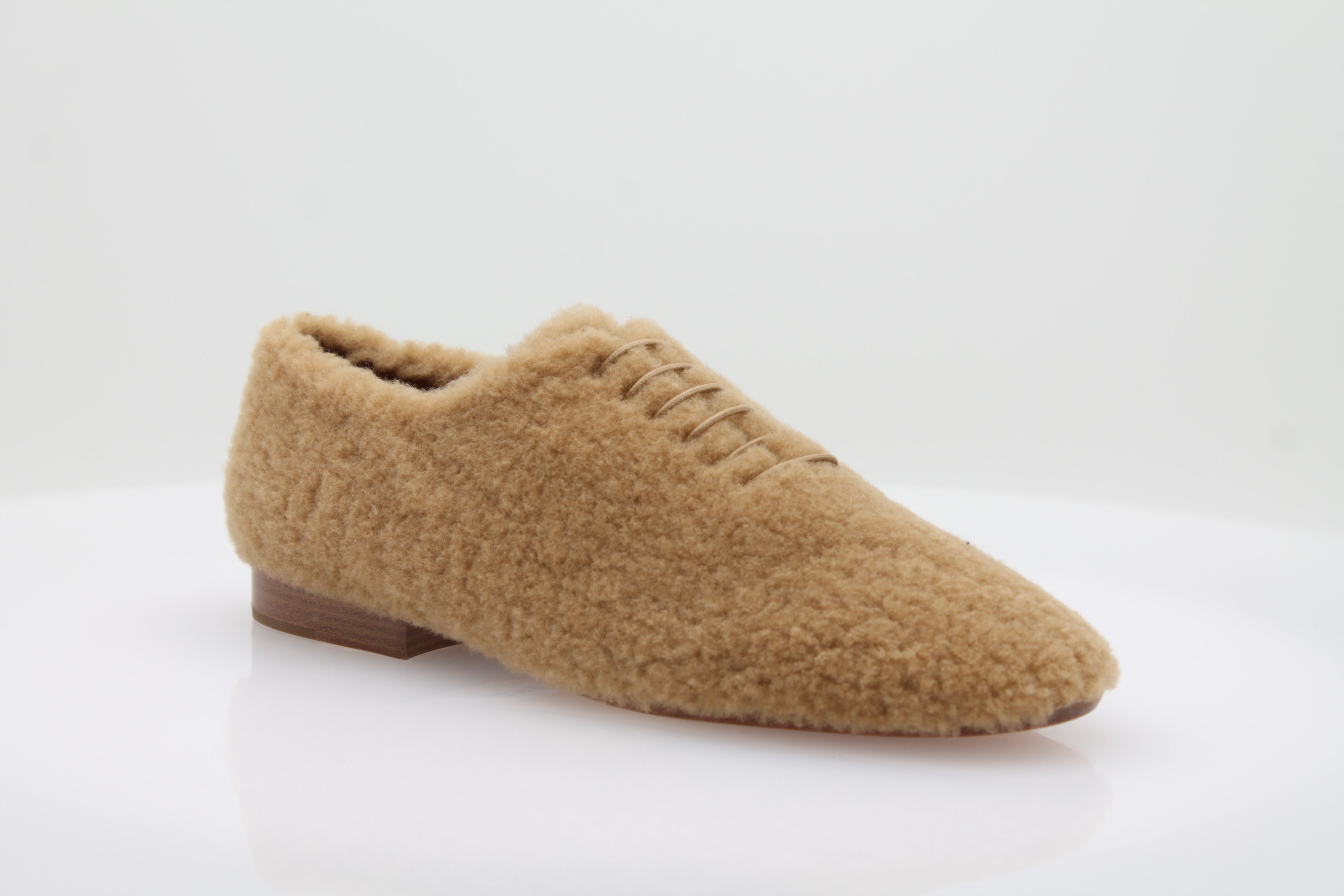 Met de Jessie Richelieu Brown presenteert Chloé een schoen die een kruising is tussen een Richelieu en een loafer , opnieuw uitgevonden in een zachte en eigentijdse stijl. Volledig bekleed met textiel met schapenvachteffect , vertoont dit paar een omhullend, gestructureerd en visueel comfortabel ontwerp. De warme en natuurlijke bruine tint versterkt dit model en geeft het een tijdloze en warme look, perfect voor het koude seizoen. Deze creatie, een waar kenmerk van het Chloé-huis, combineert soberheid, creativiteit en verfijning .