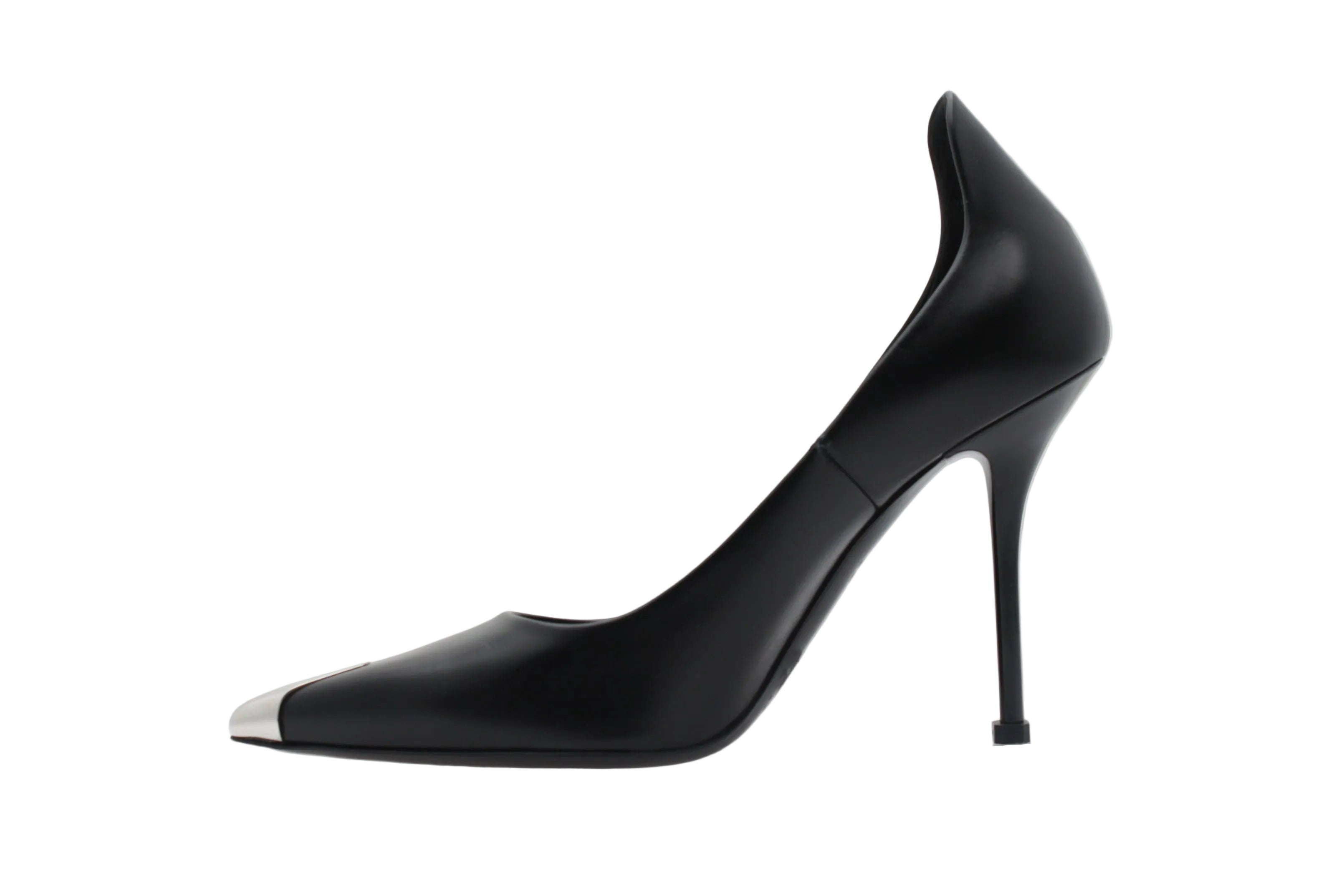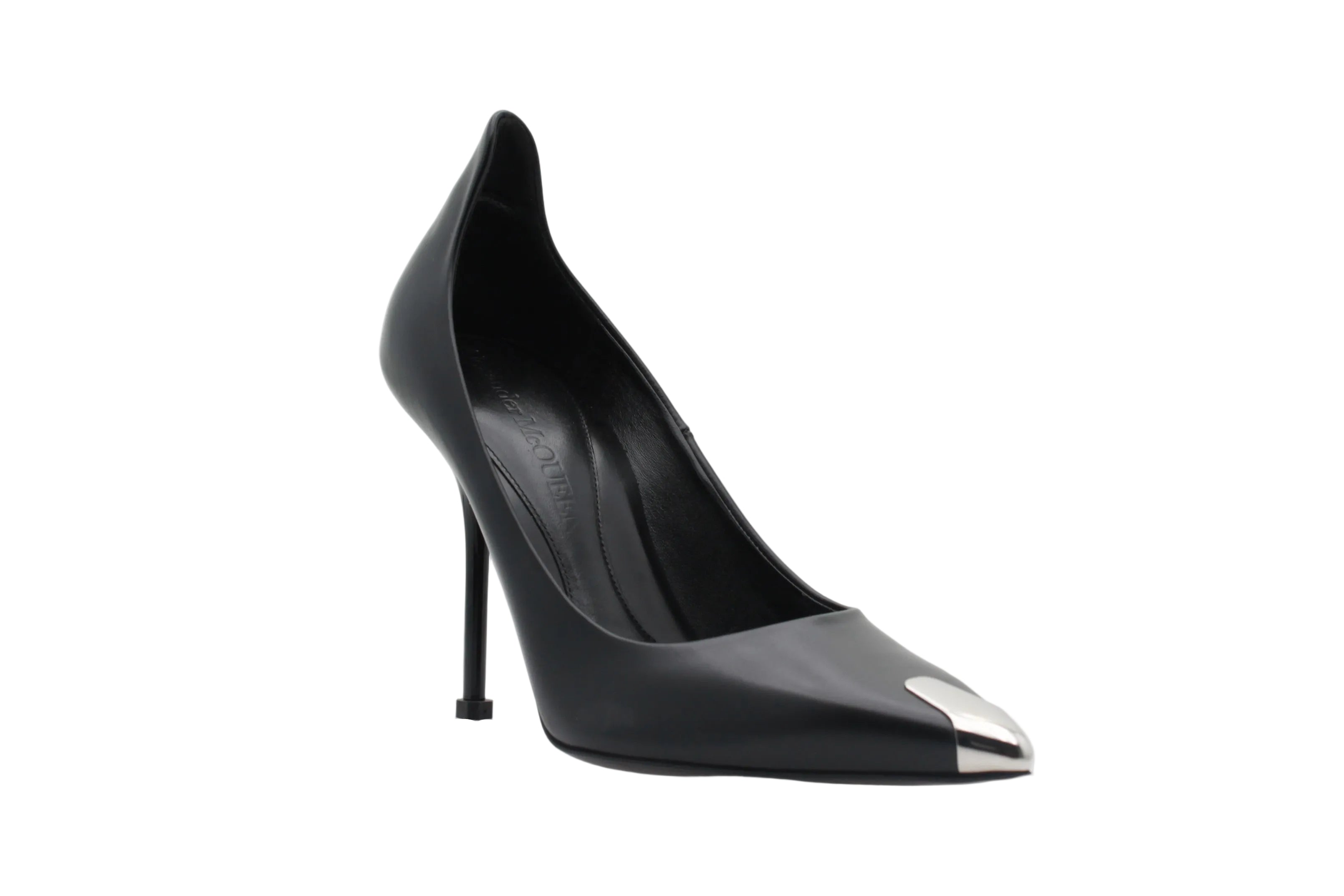 La Alexander McQueen Punk 105 Pump en noir et argent incarne une élégance tranchante, entre classicisme et esprit couture. Réalisée en cuir lisse noir, elle séduit par sa silhouette élancée, son bout pointu et son talon aiguille de 105 mm, tandis que son embout métallique argenté apporte une finition audacieuse et immédiatement reconnaissable.