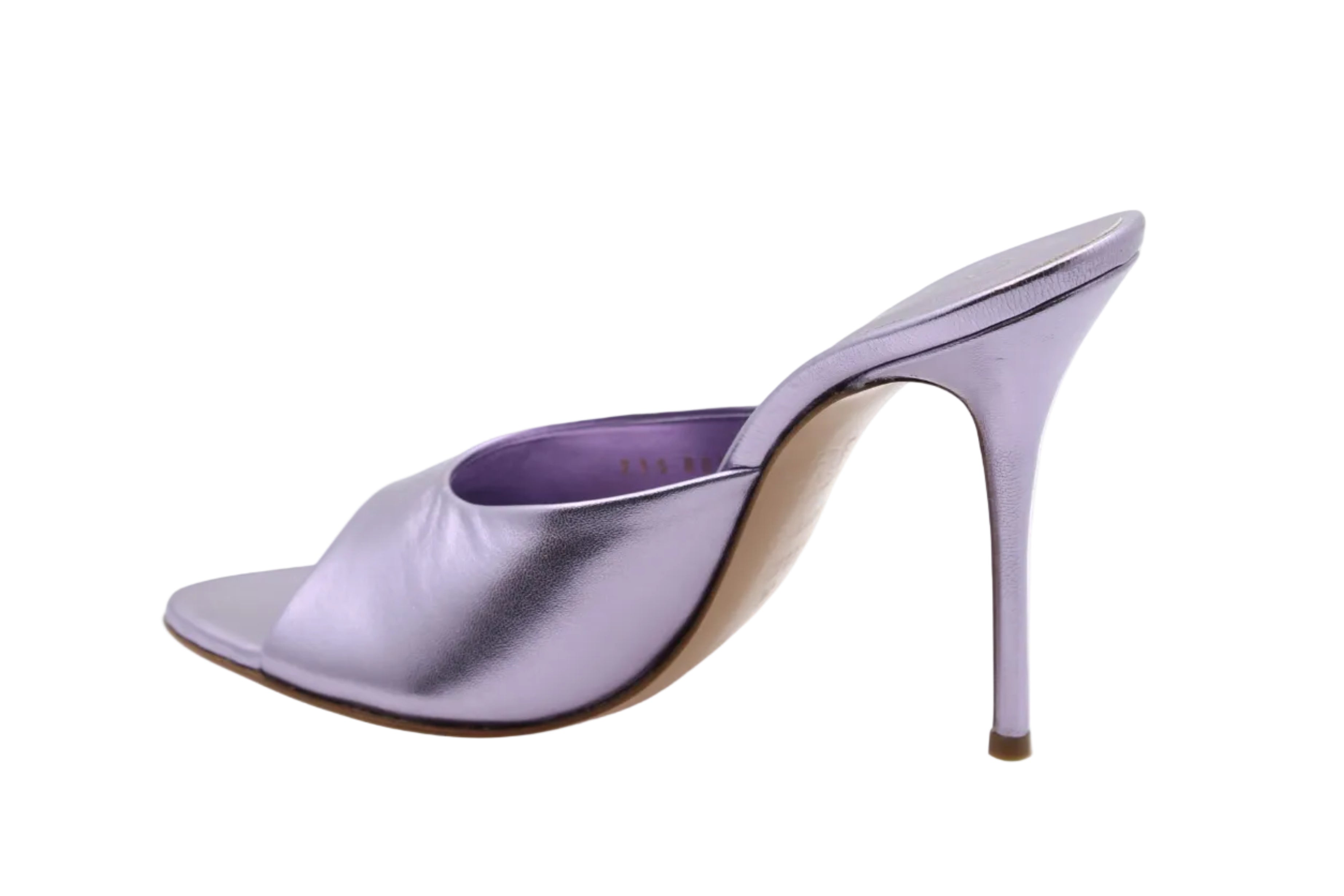 Ces sandales violettes à talon sont tout en cuir et pailletées avec un talon de 11 cm.