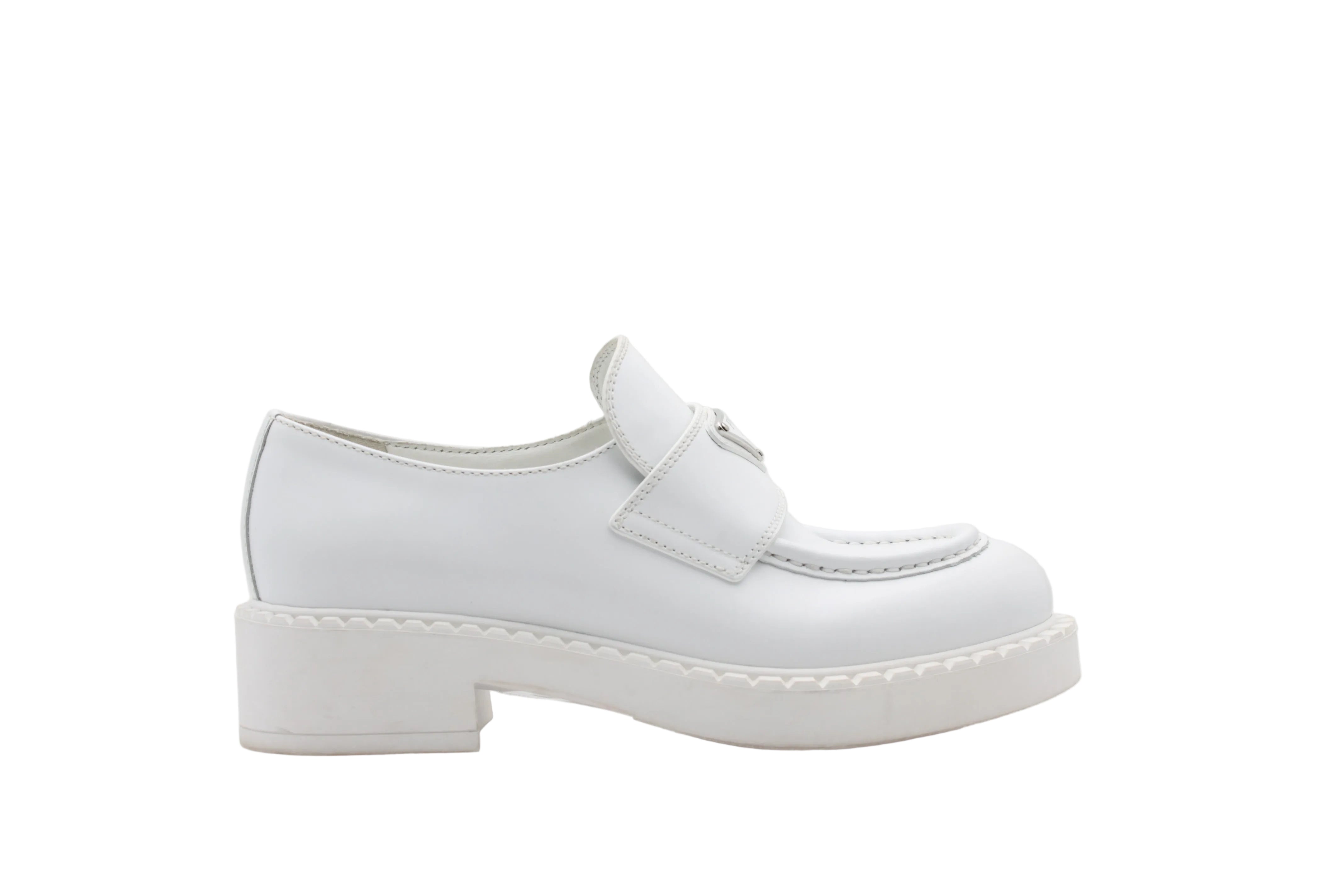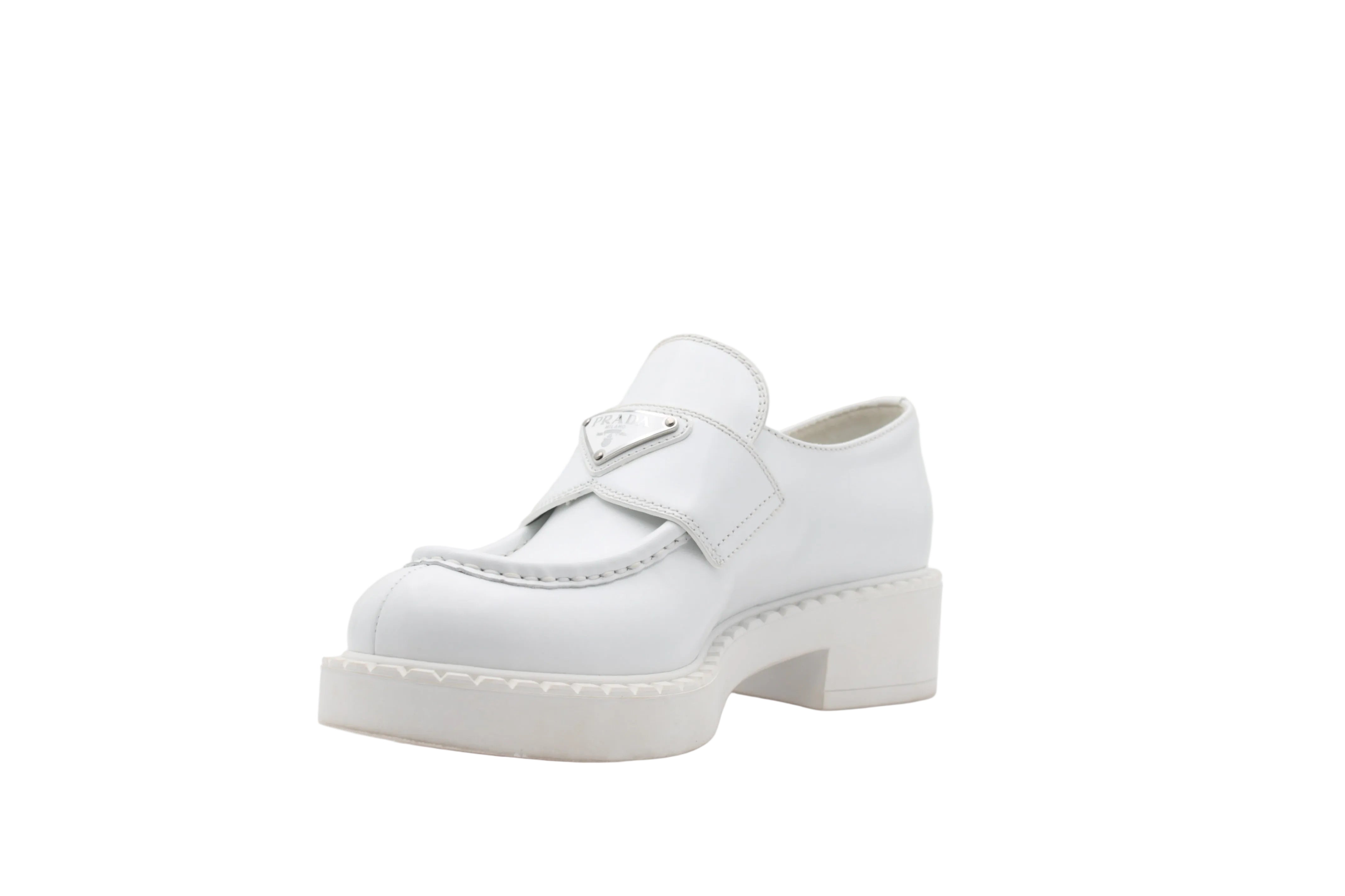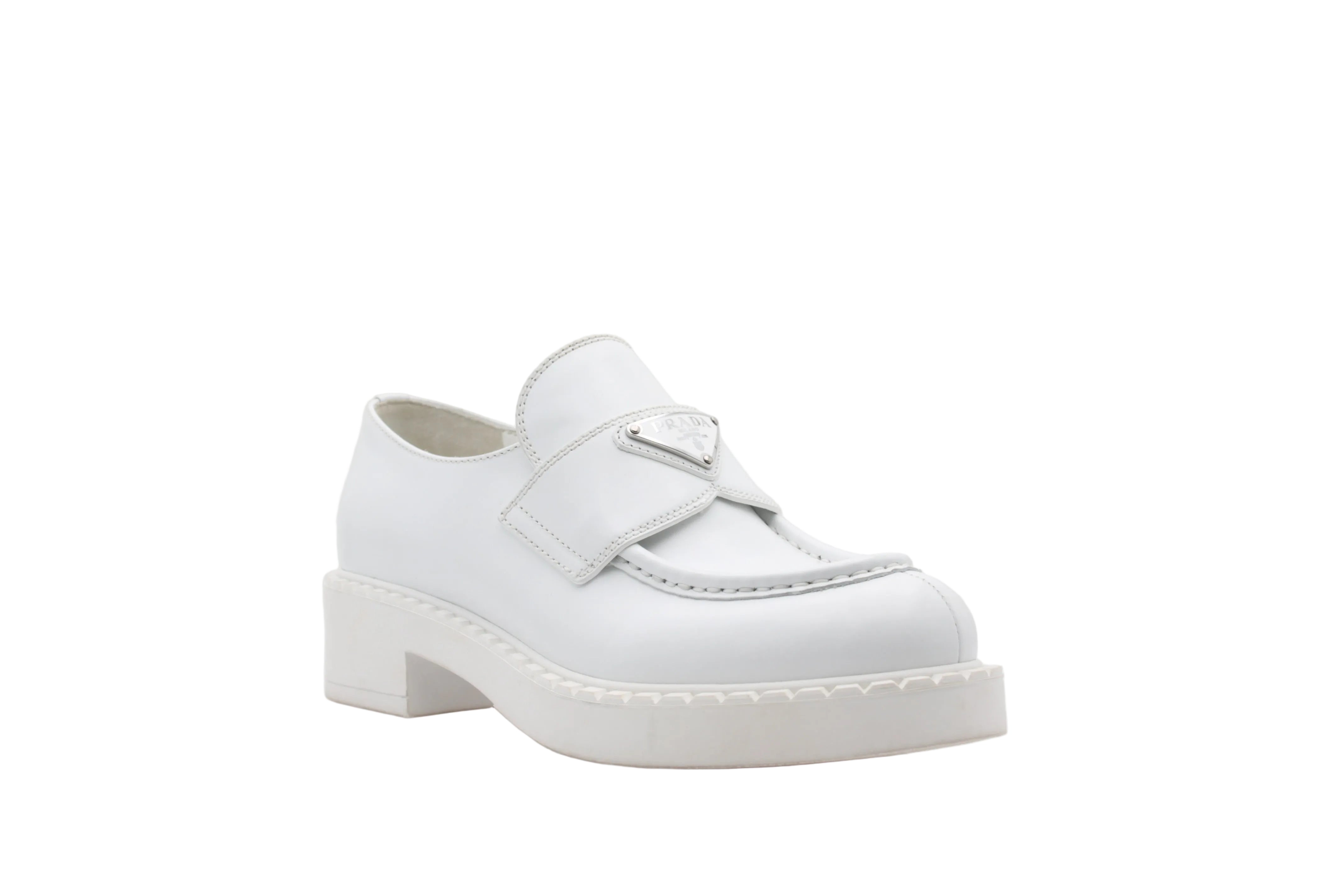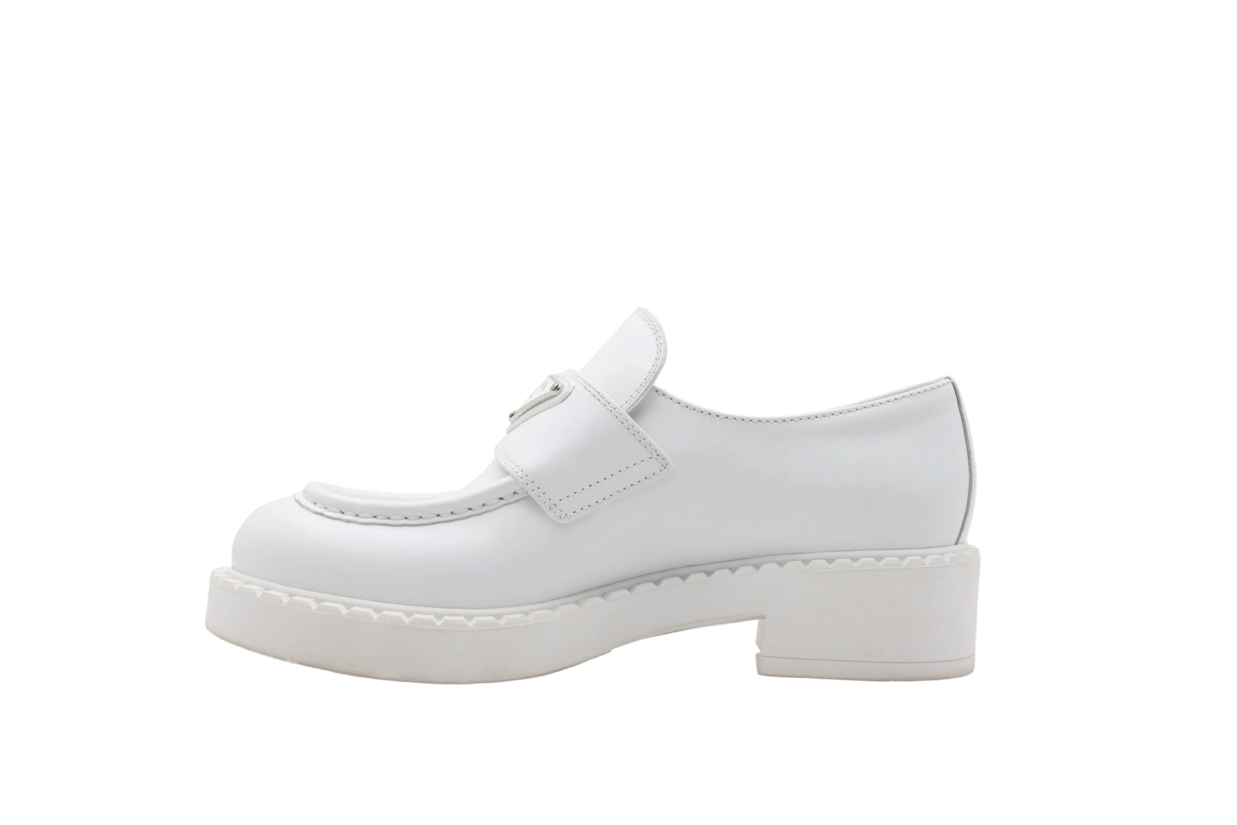 Mocassin de luxe Cuir lisse premium Bride frontale avec plaque triangulaire Prada Talon bloc confortable Semelle épaisse Style chic et contemporain